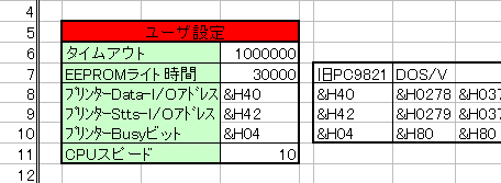 なお、今回のテストの結果は必ずAAID.xlsのシートUSER.hへ右記欄のように記入する必要があります。これをしないとAAIDのチップへの読み書きができません。プリンターI/Oのアドレス、Busyの値を&H付きの16進数で半角で記入します。またスピードテストの値も書き込んで下さい。