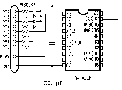 右図の配線図のように配線します。簡単な回路なのですぐに作れると思います。私は最初下図のようなブレッドボードでバラックに作り確認しました。電源はプリンターポートから貰います。余ったPB4〜PB7から供給しています。